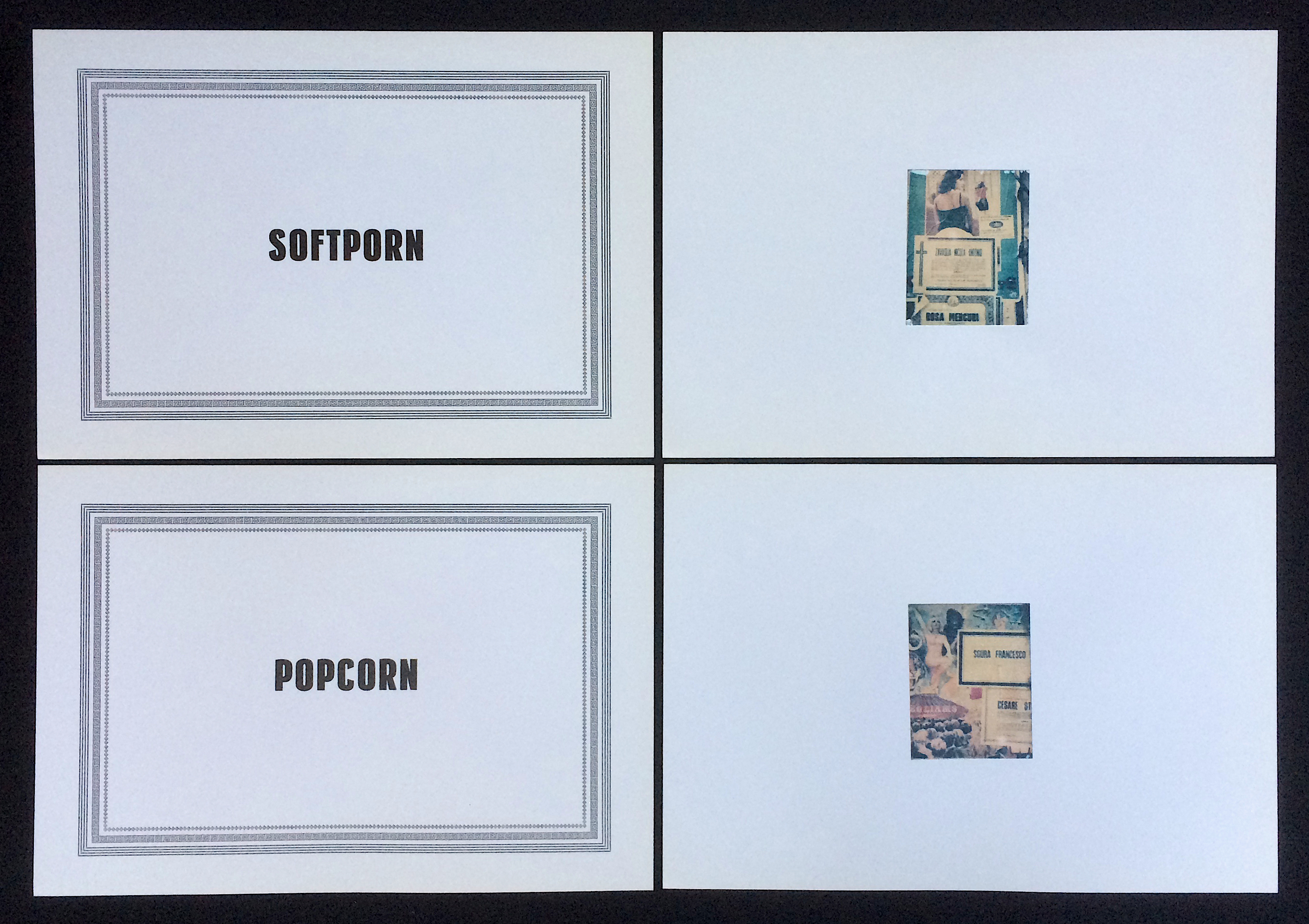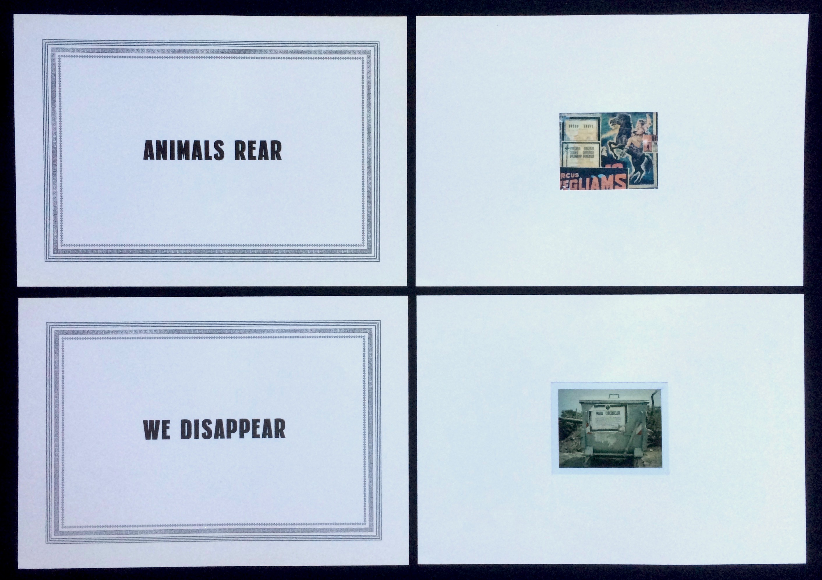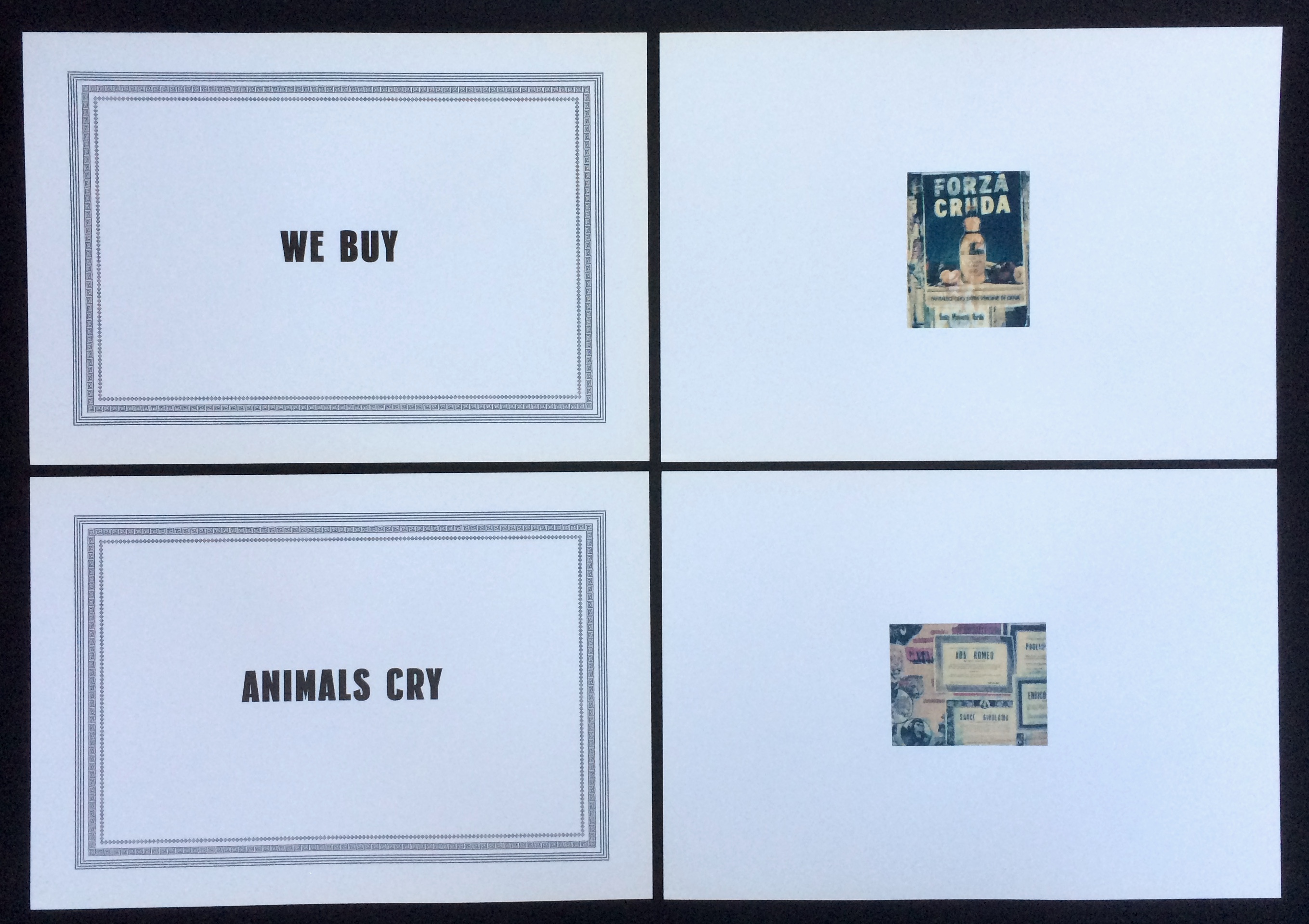 This edition is packaged in a heavy paper envelope with a black line printed across the upper left corner, like the announcements handed out to friends and relatives when someone dies. Inside such an envelope is a card containing a photograph on the left and a short text or poem on the right. The envelope here, however, contains seven Polaroid transfer prints and one photo paired with eight letterpressed cards with printed phrases that refer to each image. The cards, or broadsides, resemble the death notices commonly plastered throughout the towns of Southern Italy and small towns even in the north, with black cornices or decorative borders, and bold sans-serif typefaces.