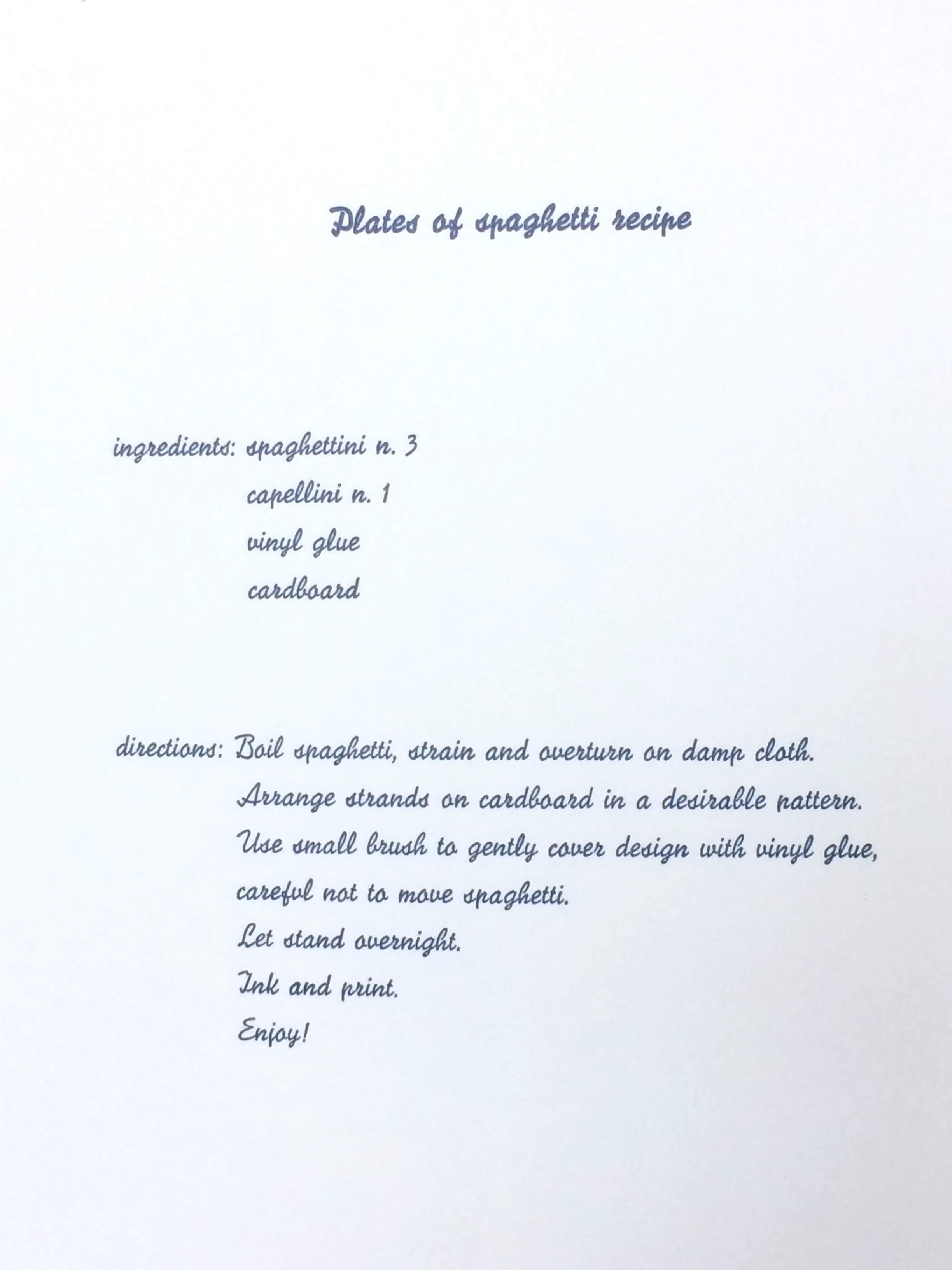 | directions: | Boil spaghetti, strain and overturn on damp cloth. Arrange strands on cardboard in a desirable pattern. Use small brush to gently cover design with vinyl glue, careful not to move spaghetti. Let stand overnight. Ink and print. Enjoy! |