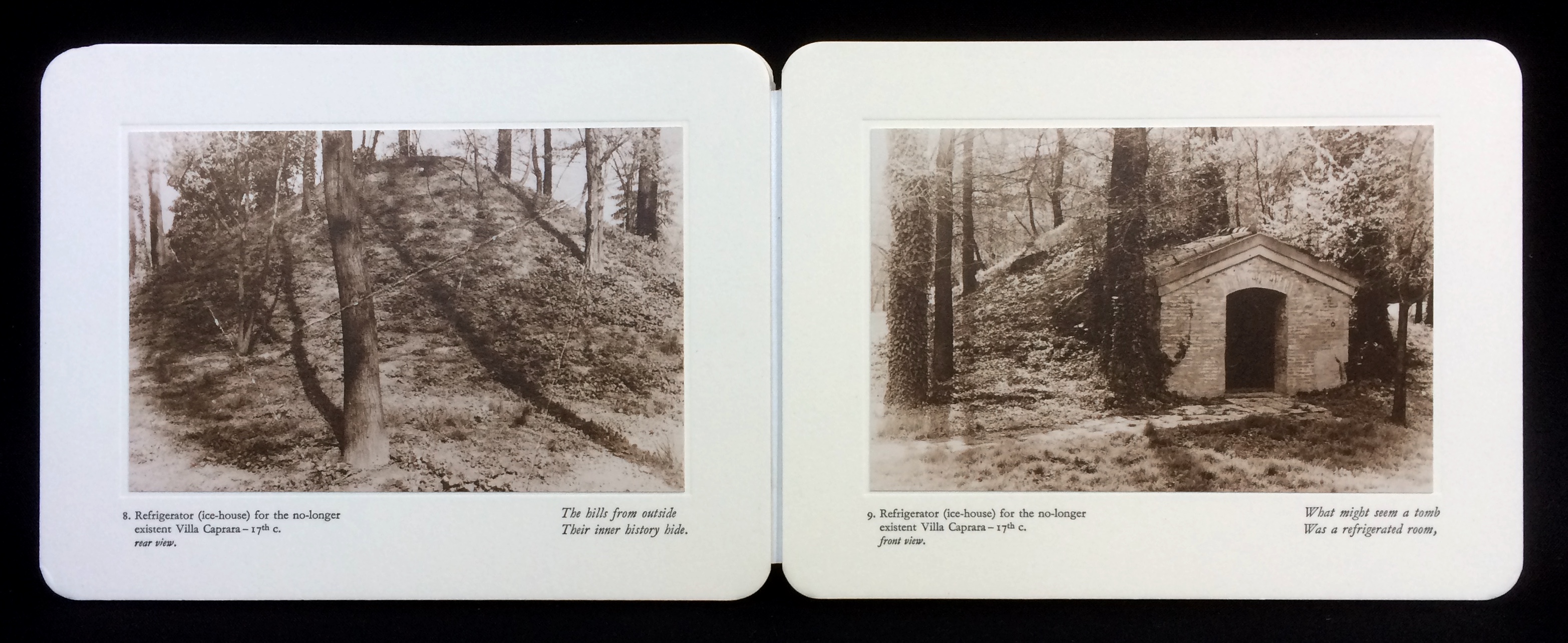 This work has the appearance of a travel souvenir book, but it functions as a vehicle for an urban studies exploration of man-made hills in the city of Bologna. “Artificial” hills are the only hills in the center of Bologna, as the area from there to Venice is largely a flat plain which was once an inland sea. From the perspective of a native of New England, these strange little hills are perplexing, as they are not the result of glacial activity. The hills have been photographed at the end of the 20th century, but the images appear to be much older, to create a feeling reminiscent of 19th century photographs. The chemicals and the printing processes used, requiring two printings and four baths for each of twelve photographs, are historical themselves, as well as being extremely archival. Under each photograph, a text on the left printed in letterpress describes what each hill was and what it has become, while a rhyming poem on the right gives an amusing description of the nature and evolution of these various categories of hills, largely unnoticed by Bologna’s inhabitants.
