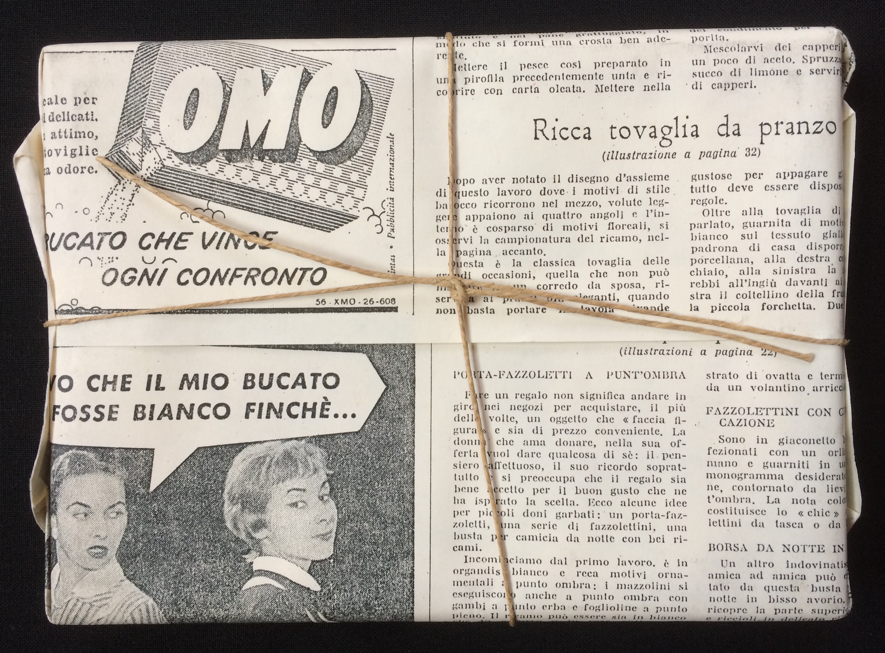 The box is wrapped up in an acid-free reproduction of a page from a woman’s magazine, October 1956, titled “Mani di Fata” or “Hands of the Fairy.” This page, wrapping the six pieces of soap, was an iron-on design for embroidery inserted as a gift in the same issue. The magazine itself was found on the floor of an abandoned villa in Calabria, not far from the town in the story. Wrapping up packets in recycled newspaper and twine is still the way fresh eggs or handmade soap travel from household to household. At the time of this story, the women used stones for washing the linen, silk, and burlap they cultivated and wove for their own use.