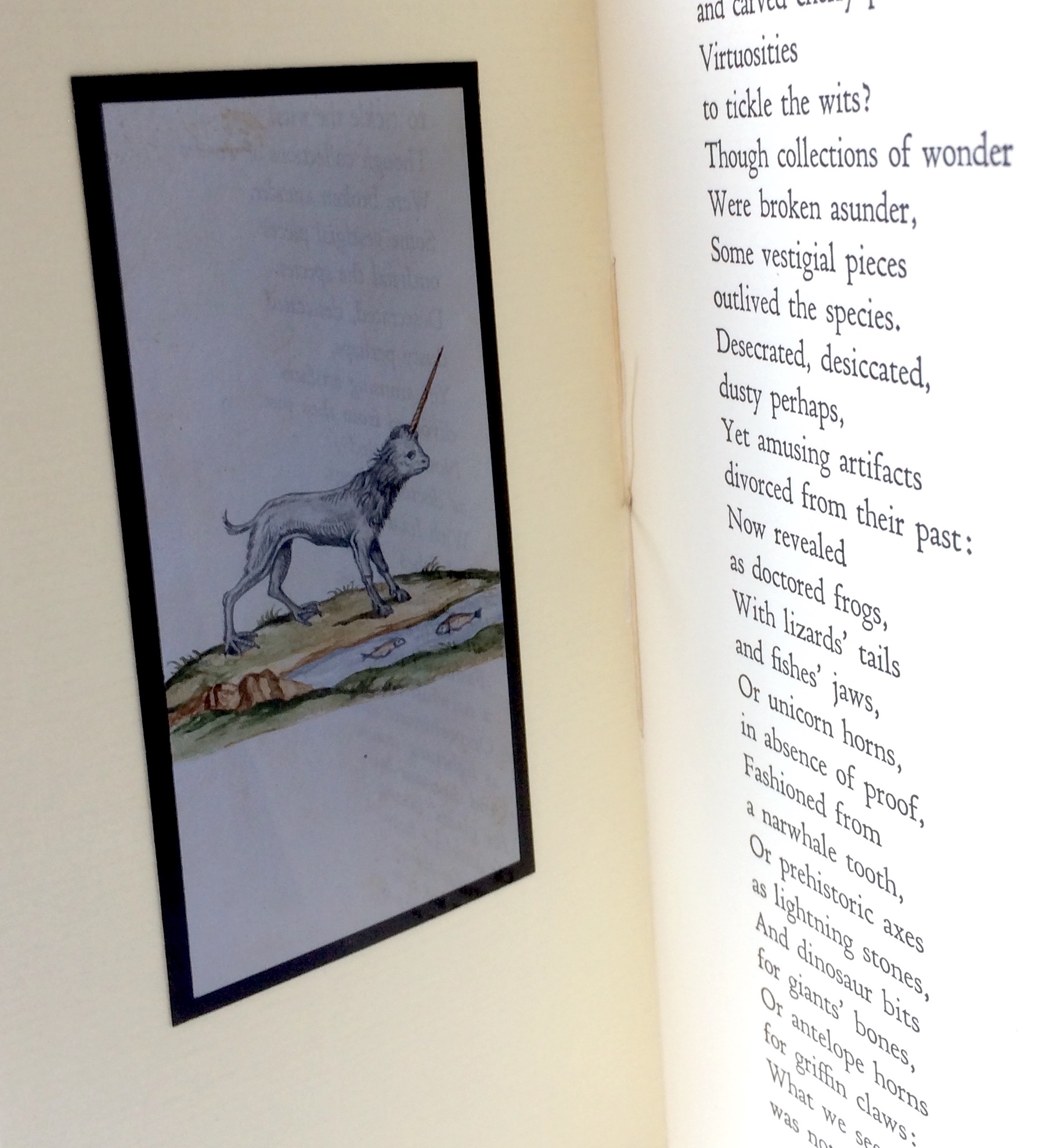 Text printed without electricity using moveable type in Centaur (a mythical beast) at Stamperia Valdonega of Verona on acid-free paper produced by Cartiere Fedrigoni. Etchings printed with the help of Manuela Candini at the Laboratorio di Sperimentazioni Grafiche Leoni-Whitman, in Bologna, a stone’s throw from Aldrovandi’s Collection. Assistance with calendula dyeing, printing and mica cutting provided by Kate Erb.